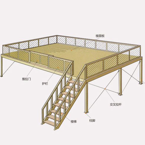 鋼平臺(tái):一樓圓管/方管做立柱支撐,二層為平臺(tái);適用于庫(kù)房較高,堆放較密集的情況。(一般為托盤平地碼放)一樓叉車/堆高車存取,二樓人工/搬運(yùn)車存取的情況。也可設(shè)升降平臺(tái)。